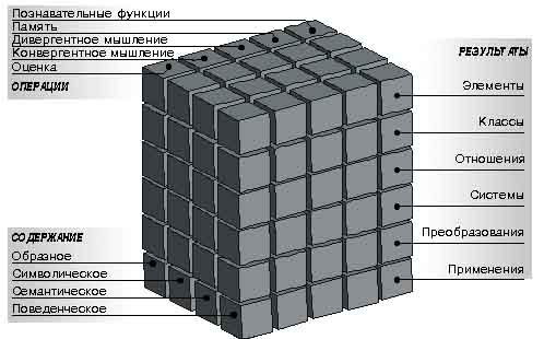 НЕКРУГЛАЯ ДАТАКУБИК ГИЛФОРДА28 августа 1959 года в журнале «Американский психолог» появилась статья Джоя Пола Гилфорда «Три стороны интеллекта». Это была стенограмма лекции, прочитанной Гилфордом 13 апреля 1959 года в Стэнфордском университете — цитадели тестирования интеллекта, где в свое время Луис Термен осуществил модификацию знаменитого теста Бине-Симона. Десятилетия, прошедшие с той поры, выявили известную ограниченность этой популярной психодиагностической методики и побудили многих психологов к новым изысканиям. Особенно спорным к концу пятидесятых стал ранее широко признанный тезис о том, что традиционные тесты, в частности Стэнфорд-Бине, измеряют некий общий интеллект. Многолетняя практика продемонстрировала, что сходные результаты тестирования могут быть получены людьми, весьма различающимися по своим способностям. Поэтому было бы неоправданным упрощением считать таких людей «одинаково умными». Индивидуальная специфика мыслительных процессов при этом ускользала от исследователей. Гилфордом была предпринята смелая попытка расширить наши представления о структуре интеллекта с помощью метода факторного анализа. Аналогичные попытки предпринимались и ранее, однако все созданные на этой основе теории являлись иерархическими, то есть подчиняли выделявшиеся факторы некой общей способности, причем соотношение факторов представлялось весьма неясным. Гилфорд попытался придать этой расплывчатой картине систематический характер, классифицировав свойства интеллекта по трем измерениям: